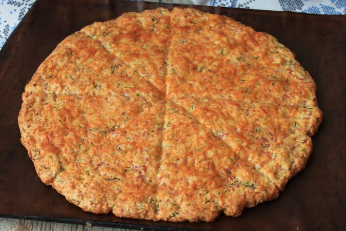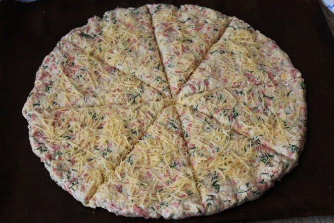 Blachę do pieczenia przykryj papierem i rozprowadź całą masę. Delikatnie uformuj rękami okrągłe ciasto o grubości do 1,5 cm i od razu możesz pokroić ciasto na 8 części - jest to opcjonalne, ale wtedy wygodniej jest je podzielić. Teraz bierzemy pozostały kawałek sera, ścieramy go na drobnej tarce i rozprowadzamy na powierzchni.