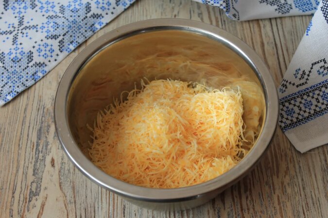 Odcinamy mały kawałek sera (około 20 gramów) i odkładamy go na bok - będzie potrzebny na samym końcu. Pozostały ser zetrzyj na drobnej tarce.