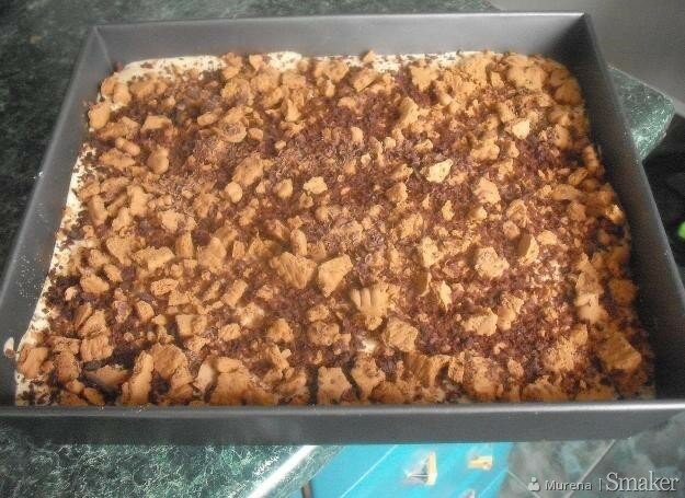 Tak przygotowaną masę przełóż do formy wyłożonej herbatnikami czekoladowymi i dokładnie wyrównaj. Wierzch posyp herbatnikami, które nam zostały i pozostałą startą czekoladą.