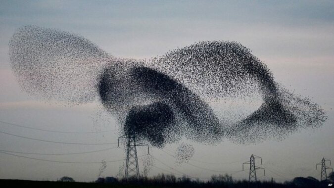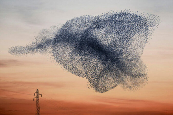 Taniec szpaków (szemranie). Tysiące ptaków gromadzi się w ogromnych stadach, które dynamicznie formują się w niesamowite niebiańskie postacie, nieustannie kurcząc się i rozluźniając
