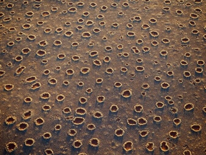 „Magiczne kręgi” w Namibii. Niektórzy badacze uważają, że kręgi te pojawiają się w wyniku pracy termitów piaskowych.