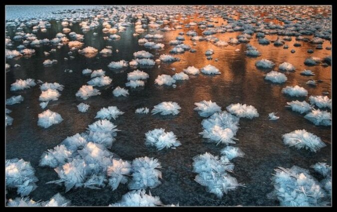 Arktyczne kwiaty lodowe. Kryształy o wysokości kilku centymetrów, które tworzą się na powierzchni cienkiej warstwy lodu, gdy różnica między jego temperaturą a temperaturą powietrza wynosi co najmniej 20 stopni