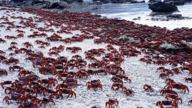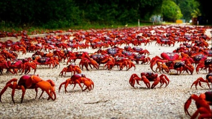 Emigracja czerwonych krabów. Każdego roku na Wyspie Bożego Narodzenia (w pobliżu Australii) miliony krabów lądowych przemieszczają się do oceanu, aby złożyć jaja