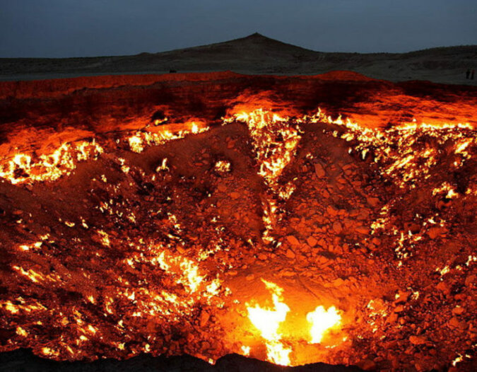 Darvaza („Drzwi do podziemi”). Krater gazowy w Turkmenistanie o średnicy 60 mi głębokości około 20 m