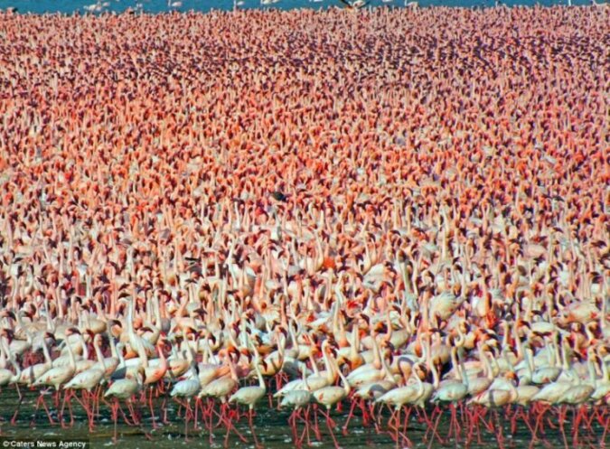 Jezioro Natron. Słone jezioro w Tanzanii, miejsce odpoczynku milionów flamingów w porze deszczowej