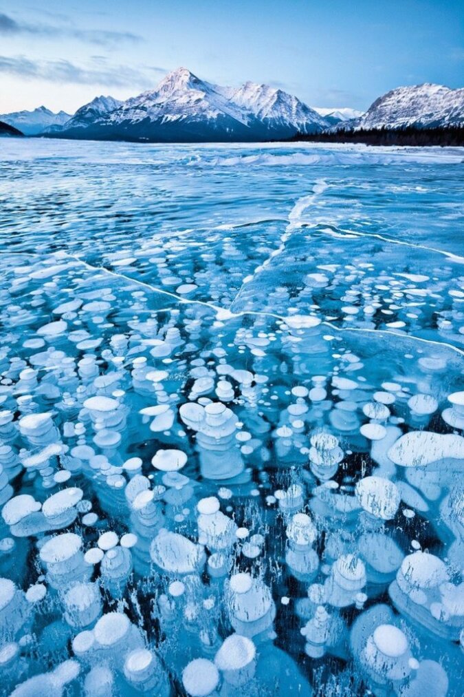 Bańki lodowe jeziora Abraham (Kanada). Bąbelki metanu unoszące się z dna zamarzają na różnych głębokościach - stąd taki efekt