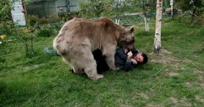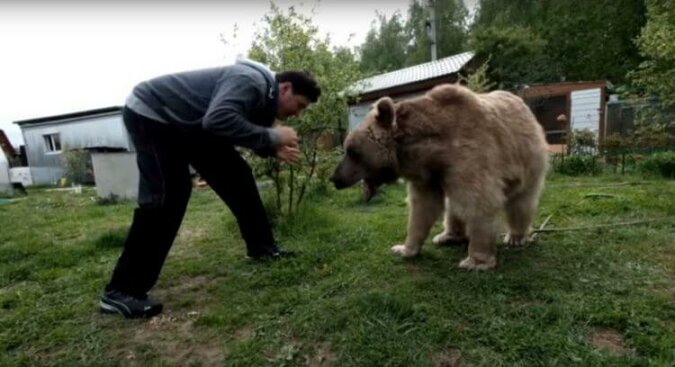 Podczas jedzenia niedźwiedź siedzi przy stole. Ma własny oddzielny dom, w którym mieszka. Nikt nie trenował tego niedźwiedzia, ale nie jest on agresywny tylko miły i delikatny.