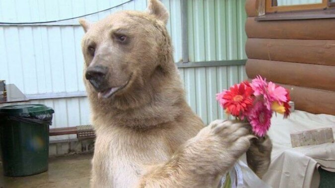 Niedźwiedź pozwala się przytulać i czesać. W tym czasie siedzi cicho. Ponadto niedźwiedź radośnie bawi się z rodziną. Wygląda trochę jak pies, tylko jest nieco większy.