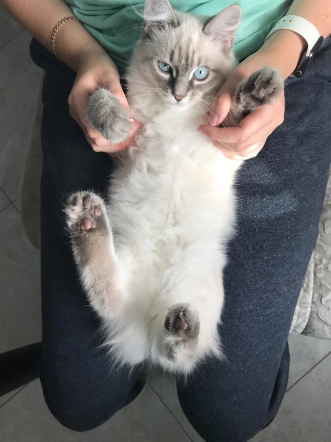 Teraz boję się w ogóle ruszać w nocy. Śpi ze mną. Najpierw w nogach. Ale gdy tylko zasypiam, czołga się do mnie i kładzie się przy moim brzuchu lub plecach, w zależności od tego, na której stronie śpię. A gdy tylko się budzę i nawet lekko poruszam ręką, zaczyna śpiewać, łazi po mnie, prawie wspina się na moją głowę i śpiewa. Tak głośno śpiewa. Gryzie mnie też w nos, mówiąc, kocham cię.