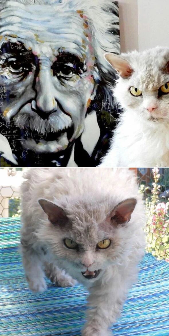 Swoje imię zawdzięcza podobieństwu do Alberta Einsteina. Właściciele uważają, że kot ma takie same siwe i niesforne włosy, jak wielki naukowiec.