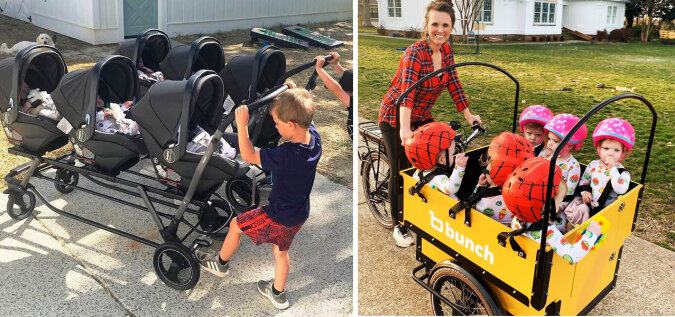 Aby móc się poruszać z tyloma dziećmi, rodzina musiała kupić specjalny wózek. Co więcej, dla roweru Courtney wymyśliła przyczepkę, w której mogłaby nosić dzieci i sama jeździć na swoim ulubionym rowerze.