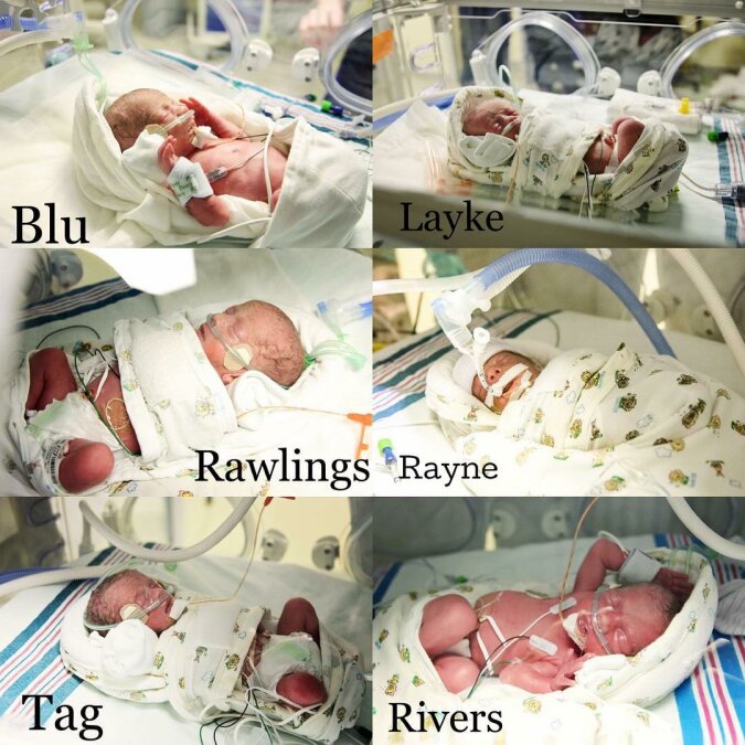 Courtney była hospitalizowana w 25 tygodniu. Od tego czasu cały dzień musiała spędzać w pozycji leżącej. W ten sposób udało jej się wytrzymać do 30 tygodnia, dopóki Courtney nie zaczęła mieć skurczów. Lekarze pilne musieli wykonać cesarskie cięcie. Urodziły się 3 dziewczynki (Rawlings, Rain and Rivers) i 3 chłopców (Blue, Lake i Tag). Podczas operacji matka wielu dzieci straciła dużo krwi, dlatego potrzebowała nawet transfuzję. Mimo to mama szybko wyzdrowiała i zaczęła wracać do zdrowia. Wcześniaki pozostawały pod opieką lekarską przez około dwa miesiące, a następnie wypisano je do domu.