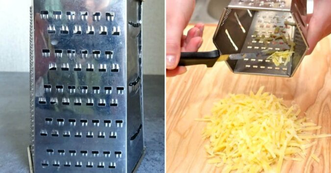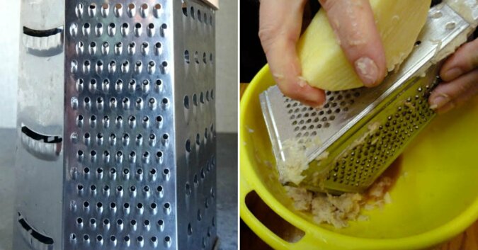 Gospodynie domowe bardzo rzadko używają tej strony tarki. A szkoda, ponieważ wygodnie jest trzeć warzywa na frytki, pokroić krążki cebuli i twardy ser, na przykład parmezan. Oczywiście jest dla tego sera specjalny nóż. Ale nie musisz go kupować, jeśli nauczysz się używać zwykłej tarki.