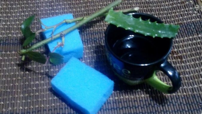 Gąbkę zanurzamy w roztworze z sokiem z aloesu, moczymy i wyciskamy.