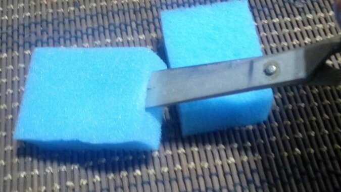 Pokrój nową (obowiązkowo) gąbkę do mycia naczyń na 2-4 części. Lepiej jest oderwać warstwę ścierną z gąbki.