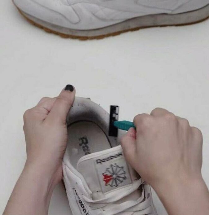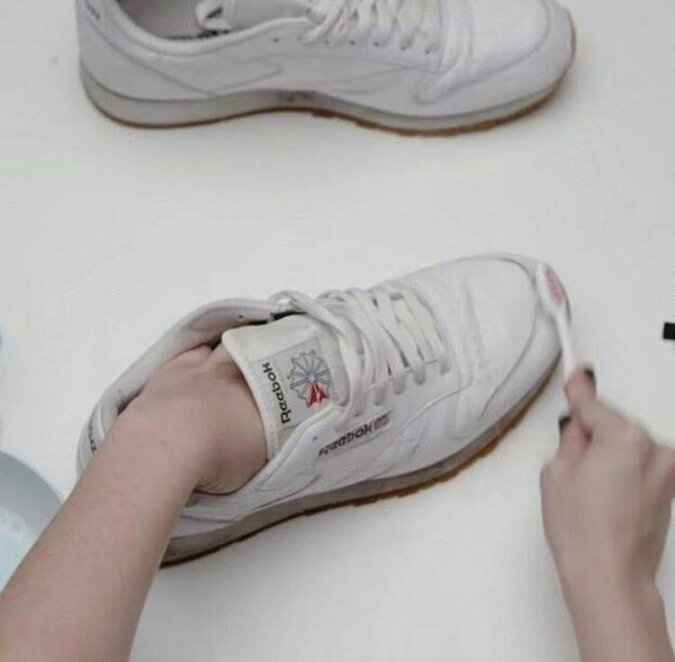 Każdy kocha białe trampki, bo te buty zawsze wyglądają pięknie i stylowo. Ale mają jedną wadę: zbyt szybko się brudzą, tracąc swój pierwotny wygląd. Eksperci znanej marki obuwniczej Reebok pokazali, jak w kilka minut można przywrócić ulubionym sneakersom dawną biel. Aby to zrobić, będziesz potrzebować najzwyklejszych rzeczy, które każdy ma w swoim domu: wody utlenionej, prostej maszynki do golenia, acetonu, sody oczyszczonej, starej szczoteczki do zębów, płynu do mycia naczyń i wody.