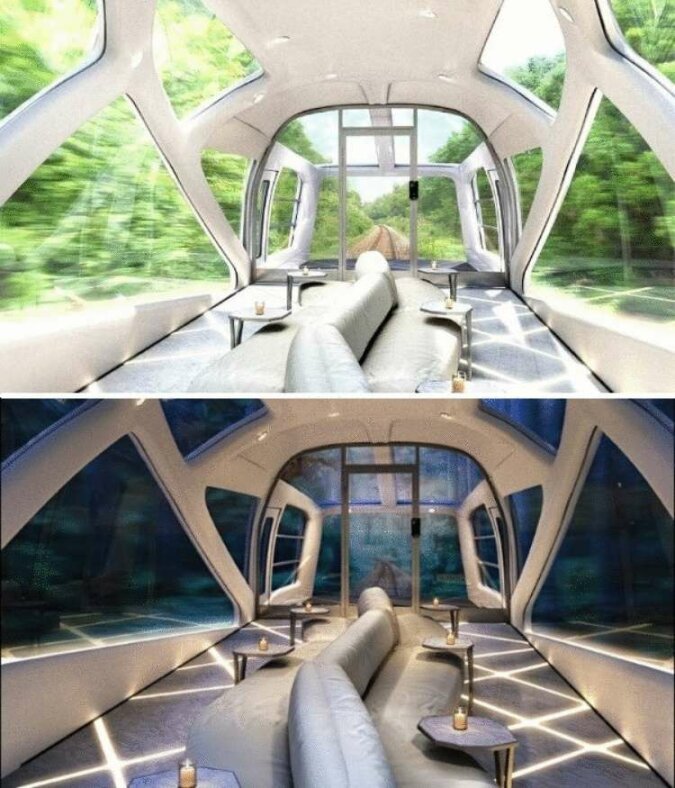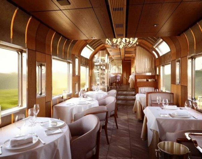 Poza tym sufit w tym pociągu jest szklany. Kiedy pasażer wsiada do pociągu, zostaje powitany przez konduktora z kieliszkiem złocistego szampana.