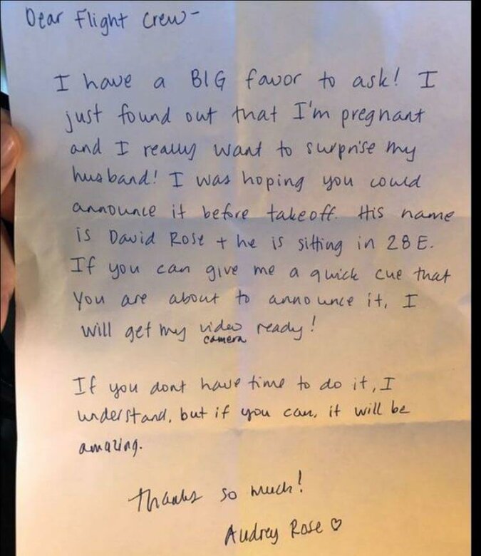 „Do załogi samolotu. Mam do Was wielką prośbę! Właśnie się dowiedziałam, że jestem w ciąży i bardzo chcę zaskoczyć męża. Byłabym niezmiernie zadowolona, gdybyście mogły ogłosić wiadomość przez zestaw głośnomówiący przed startem. Mój mąż nazywa się David Rose i siedzi na miejscu 28E. Jeśli nie znajdziecie na to czasu, wszystko zrozumiem. Ale jeśli jednak się uda, będę niezmiernie wdzięczna! Dziękuję bardzo. Audrey Rose ”