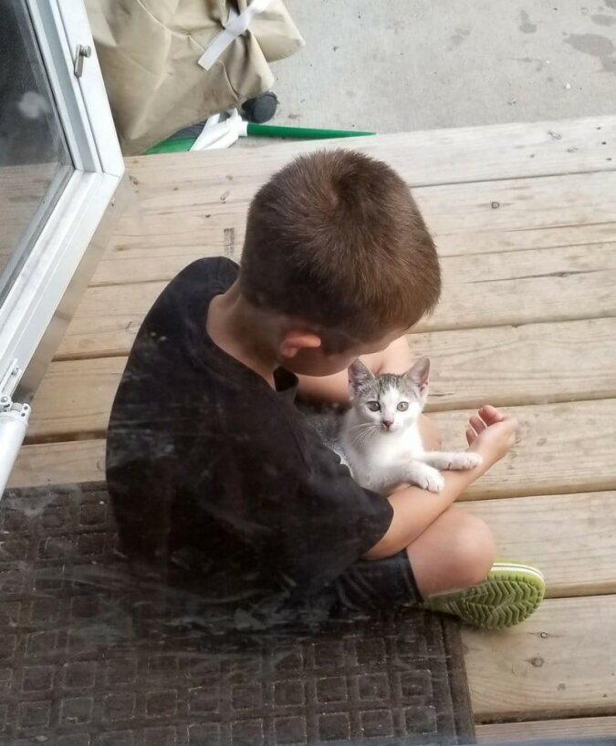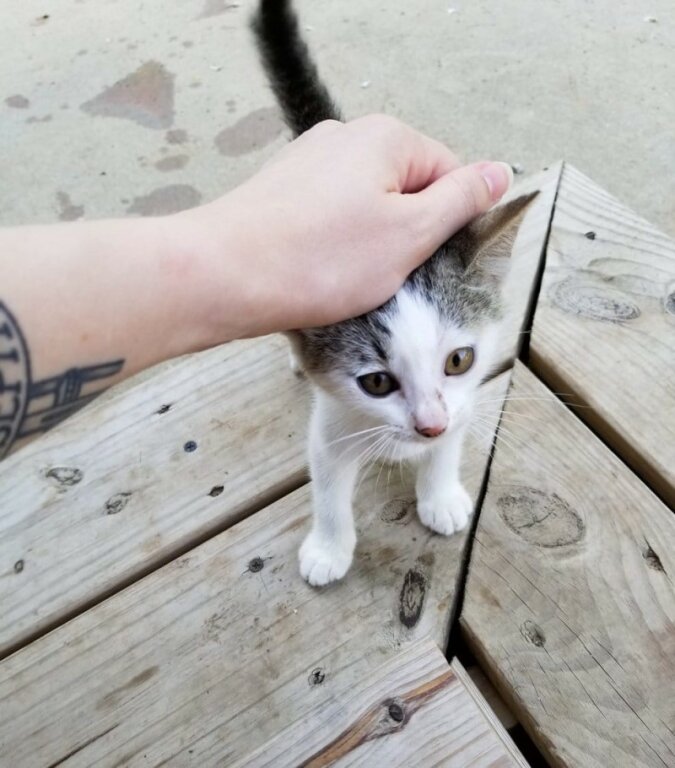 Kilka dni później ludzie usłyszeli miauczenie dochodzące od strony tylnych drzwi. Ariel poszła na ten dźwięk i zobaczyła najmniejszego kociaka, który przyszedł sam. Maleństwo bało się dziewczyny i cofało się za każdym razem jak ona podchodziła bliżej.