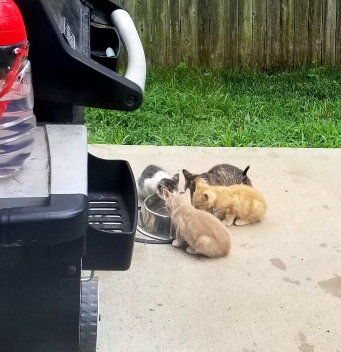 Dziewczyna zapytała sąsiadów o kocięta, ale nikt nic nie wiedział. Trochę zaniepokojona kociakami, Ariel i jej rodzina zaczęli zostawiać jedzenie dla kociąt w nadziei, że zgłodnieją i wrócą.