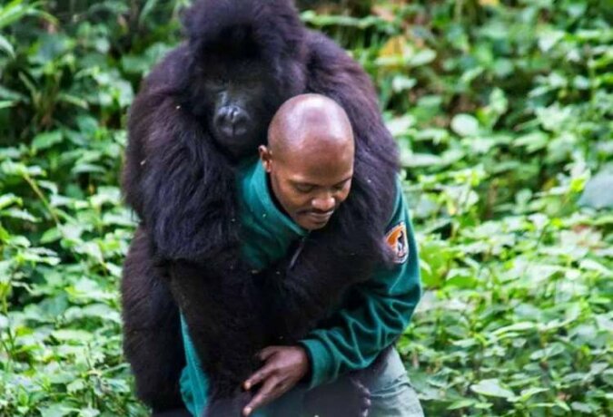 W przeszłości rezerwat bardzo ucierpiał na skutek wojen i lokalnych bitew. Ponadto kłusownicy zabijają goryle na mięso i tradycyjną medycynę. Strażnicy walczą o bezpieczeństwo zwierząt, a ich bliski związek jest widoczny nawet na zdjęciu.