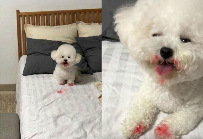 Zobaczyć swojego psa leżącego na łóżku z łapami i mordką we „krwi” najwyraźniej nie jest tym, czego chciałby właściciel.