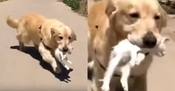 Ten widok nie jest oczywiście dla osób o słabym sercu - ogromny pies niesie w pysku słabego i bezradnego kociaka. Ale w końcu przynosi maleństwo do domu właścicieli, a oni nie odmawiają pomocy.
