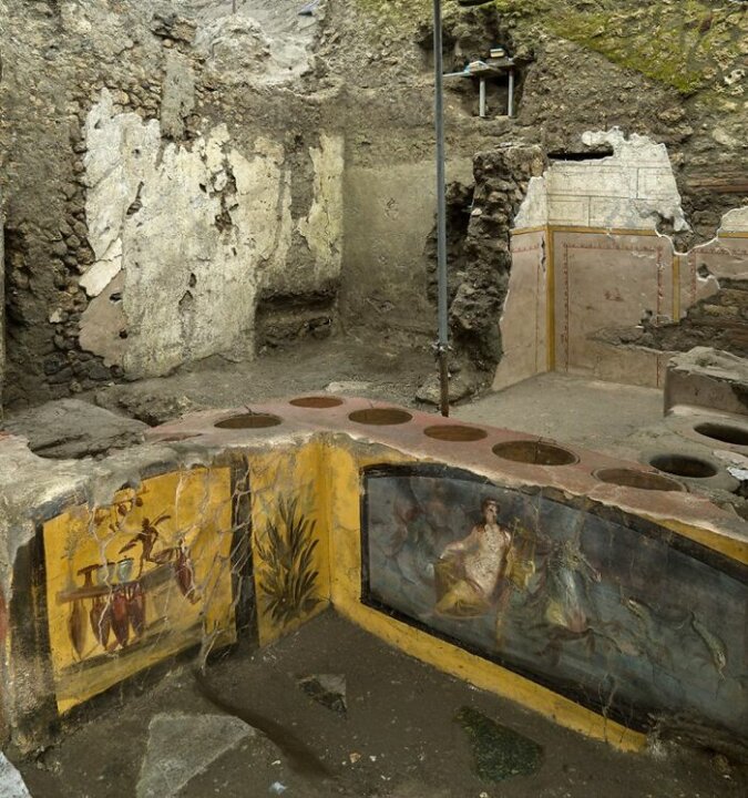 W starożytnym Rzymie takie miejsca nazywano „thermopolium”, od słów „thermos” (ciepło, gorące jedzenie) i „polium” (handel). To znaczy miejsce, w którym szybko sprzedawali świeżo przygotowane jedzenie, ale nie restauracja, bo nie ma stolików dla klientów. Ten thermopolium znajdował się na ruchliwym skrzyżowaniu i był bardzo popularny, opłacalny, sądząc po jakości i wysokich kosztach przyborów kuchennych.