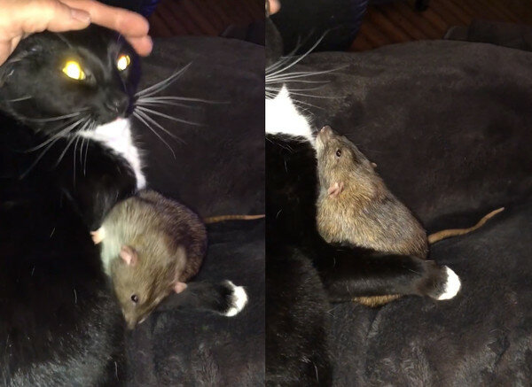 Po jakimś czasie jeden ze szczurów zdołał wydostać się z ukrycia i zaczął biec po podłodze. Pauline miała kotkę o imieniu Prudence, która pojawiła się u niej trzy lata temu. Kotka została adoptowana ze schroniska. Być może kotka tam miała kontakt z gryzoniami, ponieważ nie okazywała wrogości temu szczurowi, a po prostu podeszła i zaczęła go wylizywać. Było oczywiste, że szczur naprawdę lubił takie oznaki uwagi i nie uciekł.