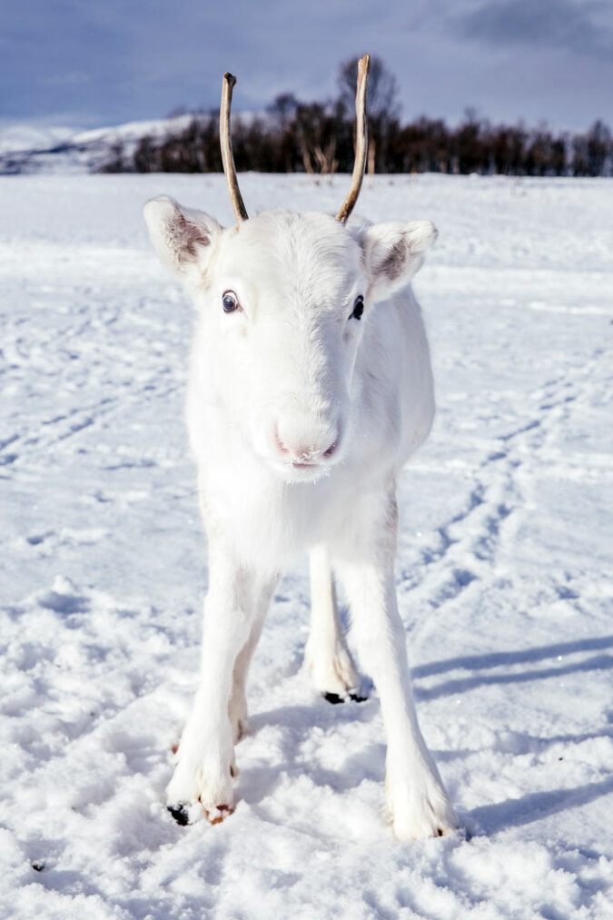 Fotograf zauważył, że reniferek wcale się go nie boi, okazał nawet duże zainteresowanie. Prawdopodobnie już przyzwyczajony do tego, że wszyscy uważają go za niezwykłego i szanują. Patrzyli na siebie przez kilka minut i to wystarczyło, aby zrobić niesamowite zdjęcia. A potem zza drzew wyszła jego mama o zwykłym odcieniu sierści, a renifer podbiegł do niej.