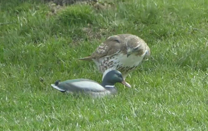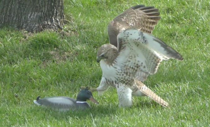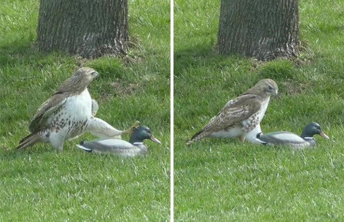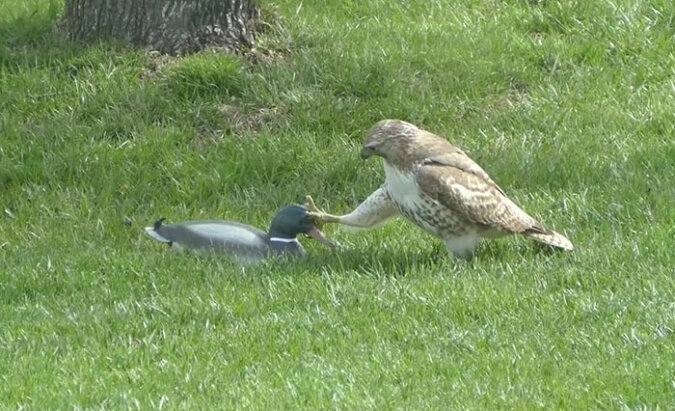 Początkowo jastrząb był tak zachwycony łatwą zdobyczą, że nie zwrócił uwagi na dziwne zachowanie „kaczki”. Bardziej się bał, że ktoś inny może odebrać upragnione jedzenie – kręcił głową na wszystkie strony! Ale z każdą sekundą drapieżny ptak zaczął coraz bardziej podejrzewać, że ta kaczka jest inna! O co chodzi?
