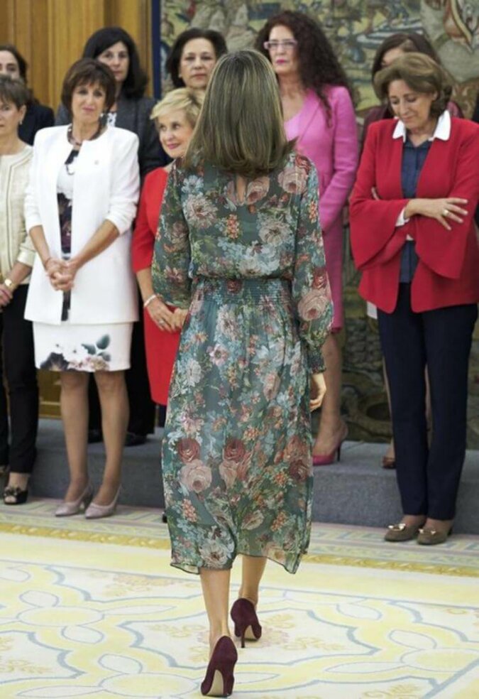 Letizia uzupełniła swoją sukienkę zamszowymi butami na wysokim obcasie w kolorze wina. Odcień buta idealnie komponował się z nadrukiem na szyfonowej stylizacji. Włosy królowej były wyprostowane, a makijaż wykonano przy użyciu różowo-bordowych cieni do powiek, co nadało efekt kompletności jej „demokratycznemu” spojrzeniu.