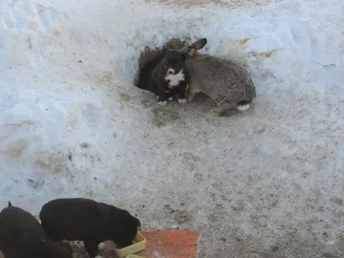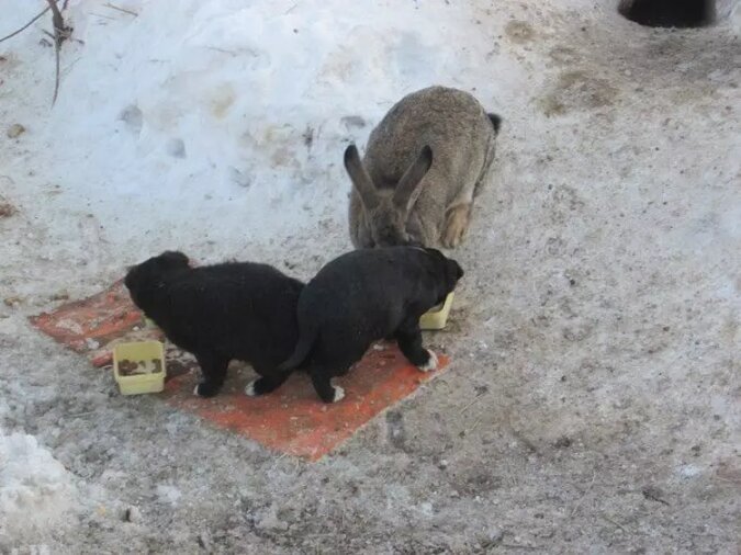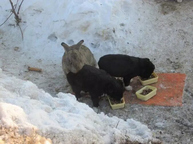 „Królik pozwolił nakarmić szczeniąt, ale przez cały ten czas mnie obserwował. A potem nie pozwolił im wyłazić z norki. Cały czas skakał wokół nich, jak szaleniec, popychał nosem, nie pozwalał kotom się do nich zbliżać. Ciągle je lizał, więc szczenięta były czyste. Gdyby nie królik, nie byliby w stanie przeżyć. Było bardzo zimno, w nocy temperatura spadała do -27 stopni.