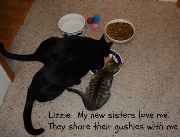 Zastępczy tata John zadbał o to, aby Shelby było wygodnie, a Lizzie zaczęła pić mleko. Po kilku trudnych dniach rodzina małych kotów zaczęła „kwitnąć”.
