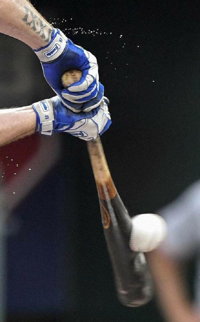Uderzenie kijem po piłce na stopklatce - zwróć uwagę na stopień natychmiastowej deformacji piłki