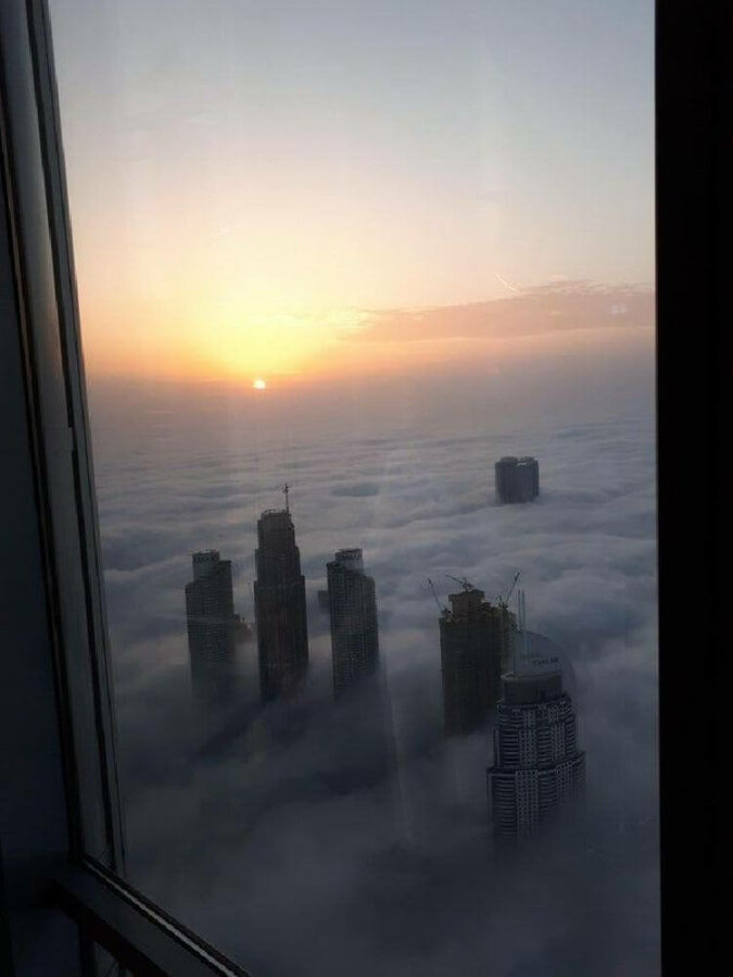 Typowy widok z górnych pięter Burj Khalifa. Jego wysokość wynosi 828 m, a wokół nie ma nic, co mogłoby się równać z kolosem, nawet chmury znajdują się niżej.
