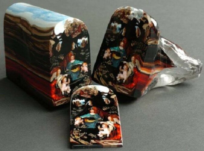 Specjalna technika odlewania szkła, w której warstwy tworzą prawdziwy obraz. W tym przypadku jest to „Madonna w grocie” Leonarda da Vinci.