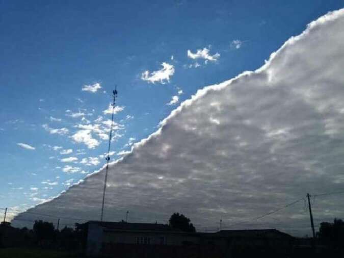 Po lewej błękit nieba, po prawej chmury burzowe, pośrodku wyraźna granica między ciemnością a światłem