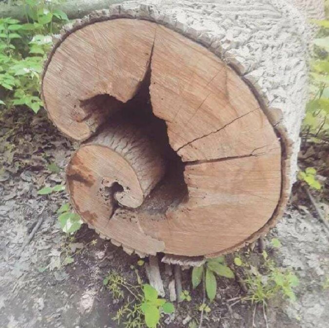 Dawno temu drzewo było bardzo uszkodzone i próbowało to naprawić za pomocą świeżej kory, ale trochę przesadziło. Wzrost kory był tak silny, że zaczęła się skręcać pod własnym ciężarem, a reszta drzewa kontynuowała rosnąć.