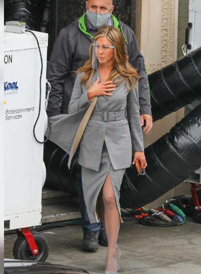 Paparazzi sfilmowali Aniston podczas przygotowań do jednej ze scen: aktorka była w szarym garniturze o niecodziennym, a zarazem efektownym kroju. Wydłużoną marynarkę z powodzeniem uzupełniał szeroki pasek w talii, a skromna długość spódnicy rekompensowała odważny krój dekoltu. Przyłbica na twarz nadała wizerunku szczególnej pikanterii.