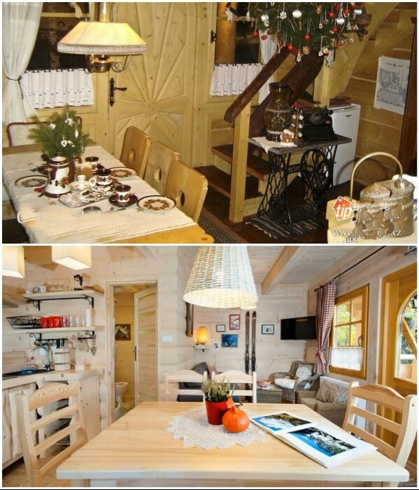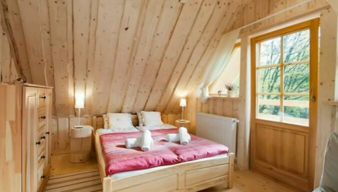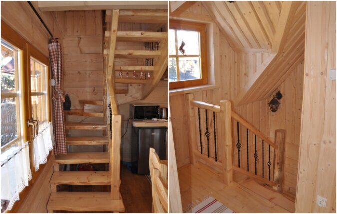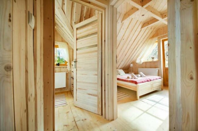 Na piętro prowadzą drewniane schody. Tutaj przestrzeń podzielona jest na 2 sypialnie. Jeden pokój jest większy niż drugi. Posiada podwójne łóżko, sofę i komody. Jest wyjście na przestronny balkon. Druga sypialnia jest bardzo mała, ale dość przytulna.