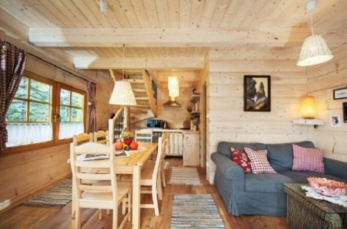 Pomimo małej powierzchni wnętrze domu z bali jest bardzo dobrze przemyślane. Na parterze znajduje się przytulny salon, kuchnia i jadalnia.