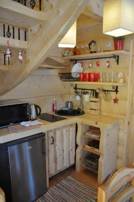 W szafkach i półkach na zawiasach można przechowywać różne naczynia i niezbędne produkty. Aby zaoszczędzić miejsce, lodówka została umieszczona pod blatem.