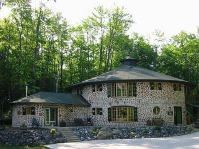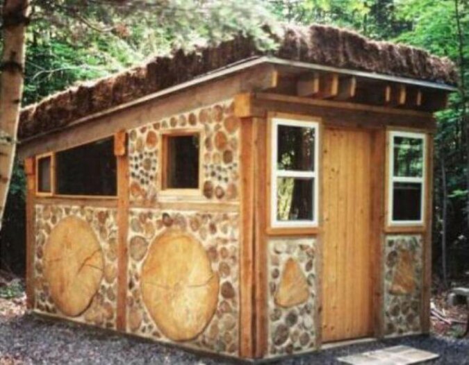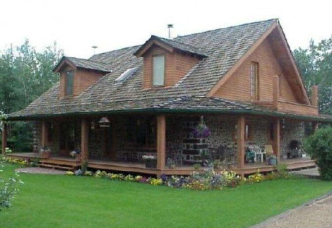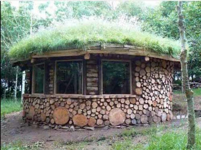 Dom ma wymiary 9x9 metrów i półtora piętra. Składam go z polan o długości 40 cm. W rogach każdego rzędu zachodziły rzędy innej ściany. Przez 50-70 cm. zrobiłem wiązanie z calowej deski. Służyła również do wyrównywania.