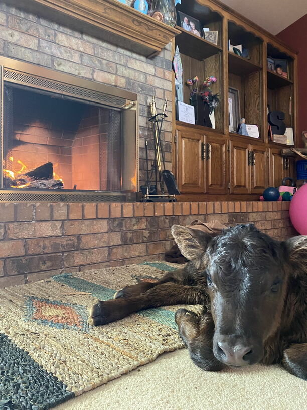 Nie codziennie widzisz krowę odpoczywającą na dywanie przy kominku. Wygląda na to, że kopytne nawet bardzo lubią takie parapetówki.