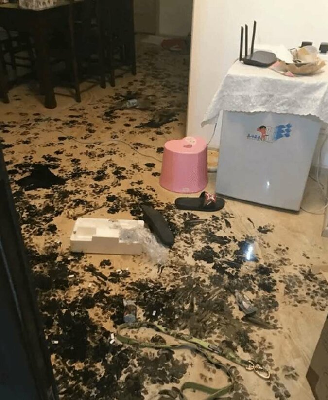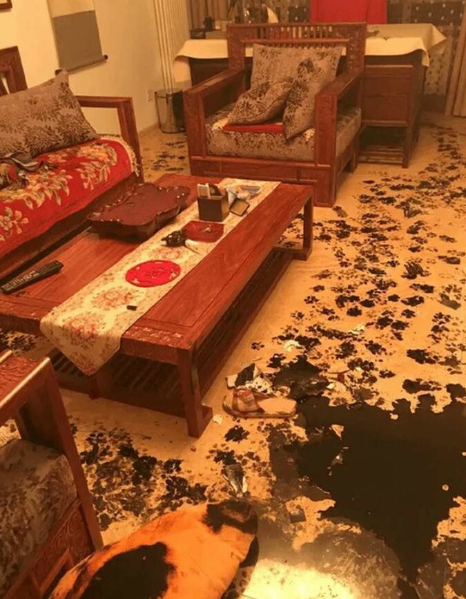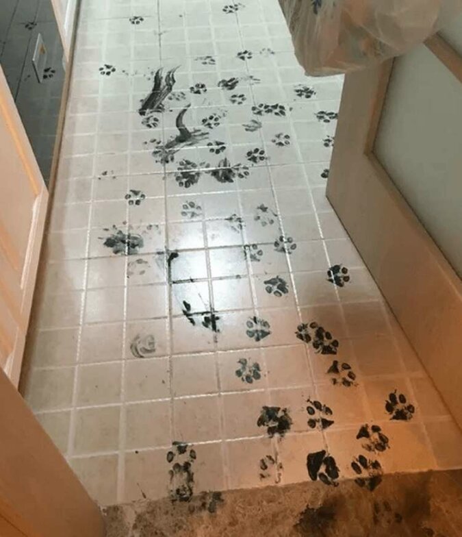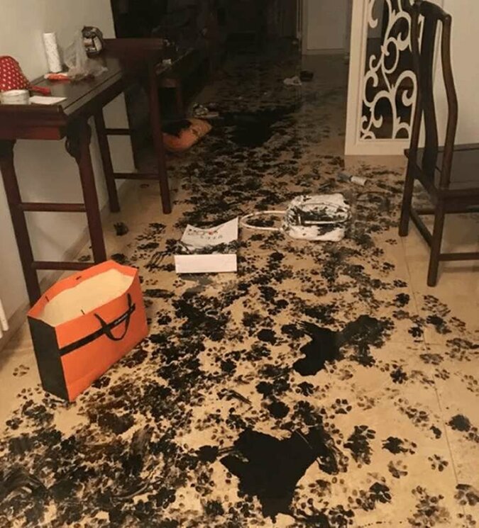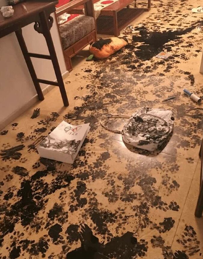Cała podłoga była ozdobiona odważnymi pociągnięciami, widać, że zwierzak starał się bardzo zaimponować swoim właścicielom.