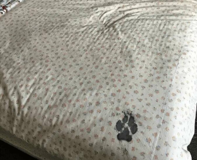 Co prawda husky nie chciał zostawić odcisków łap na łóżku, cóż, oprócz tylko jednego małego „autografu”.