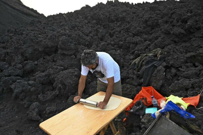 David używa wytrzymałych blach do pieczenia zaprojektowanych do temperatur do 1000 stopni Celsjusza. Najbardziej niesamowitą rzeczą jest zbliżenie się do rozgrzanej do czerwoności lawy i umieszczenie blachy do pieczenia tak, aby unosiła się na wierzchu i stopniowo opadała w dół. Co za widok!