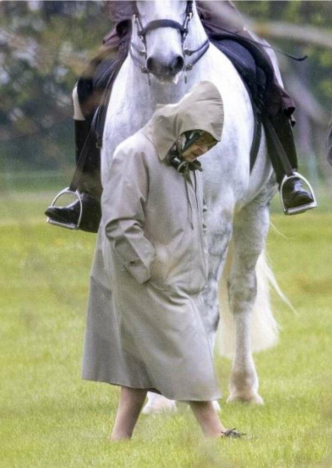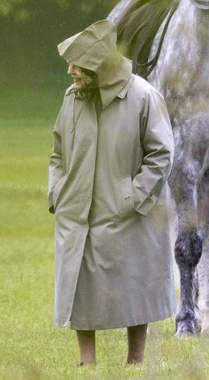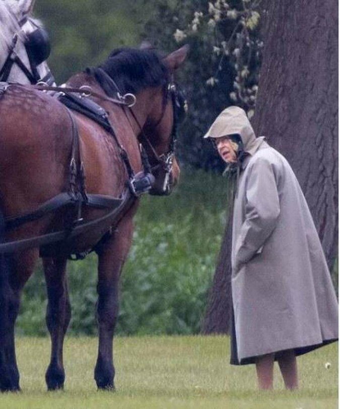 Królowa Wielkiej Brytanii pojawiła się przed swoimi poddanymi w zwykłym płaszczu, z chustą zawiązaną na głowie. Przypomnijmy, że książę Filip uwielbiał swoje konie i był bardzo dumny z powozu.