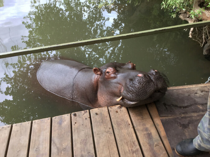 Hipopotam nie boi się obcych, z przyjemnością bierze od nich jedzenie, a nawet daje się poklepać po głowie.